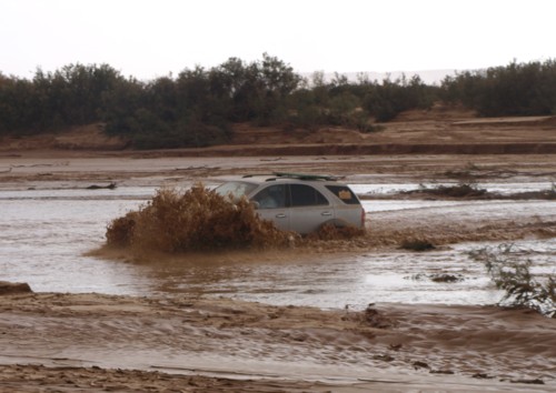 La mañana empieza con un buen desayuno y a las 9 ya estamos en la carretera rumbo a Midelt. Paco y Sonia se quedan con David porque van a recoger su coche. Cogemos la primera pista del día. Para no perder la costumbre de este viaje, la pista está fatal, muy rota a consecuencia de las lluvias. Aún así seguimos por ella y cuando estamos a unos pocos kilómetros de llegar a la carretera nos encontramos con un gran obstáculo, es el último pero es grande.